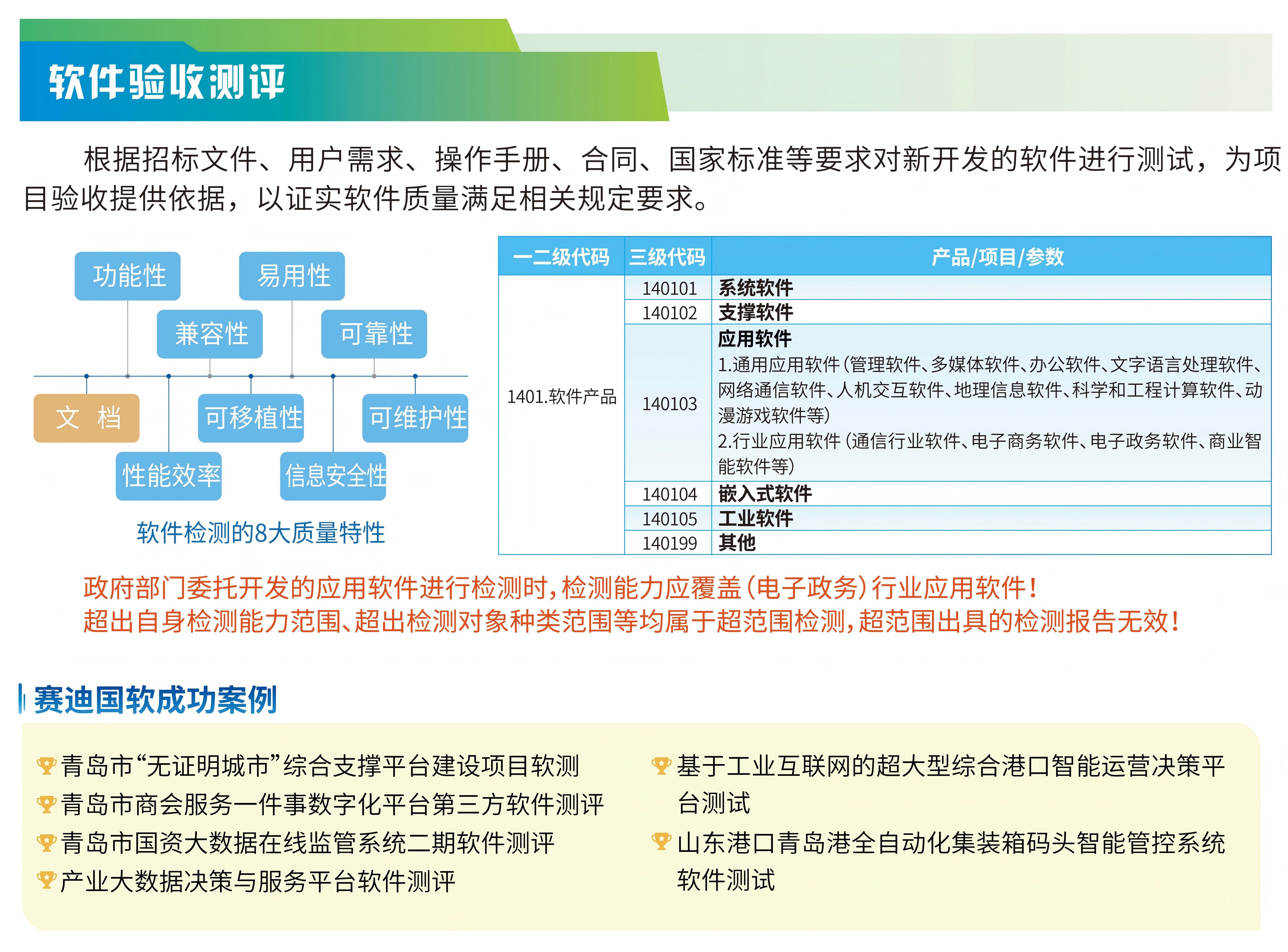 根据招标文件、用户需求、操作手册、合同、国家标准等要求对新开发的软件进行测试,为项目验收提供依据,以证实软件质量满足相关规定要求。